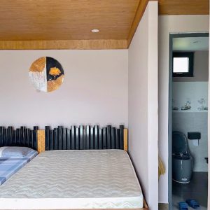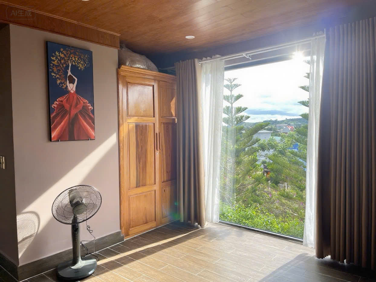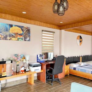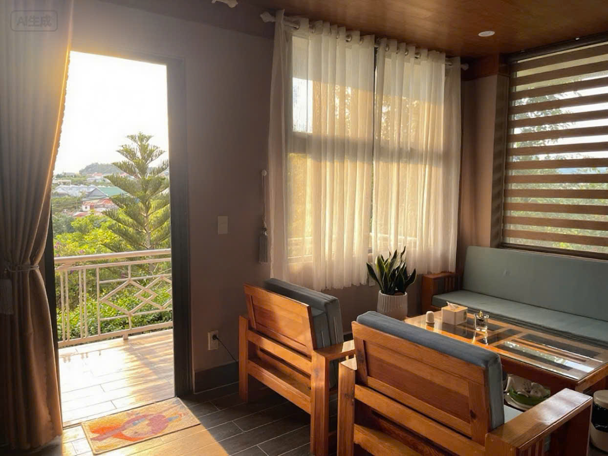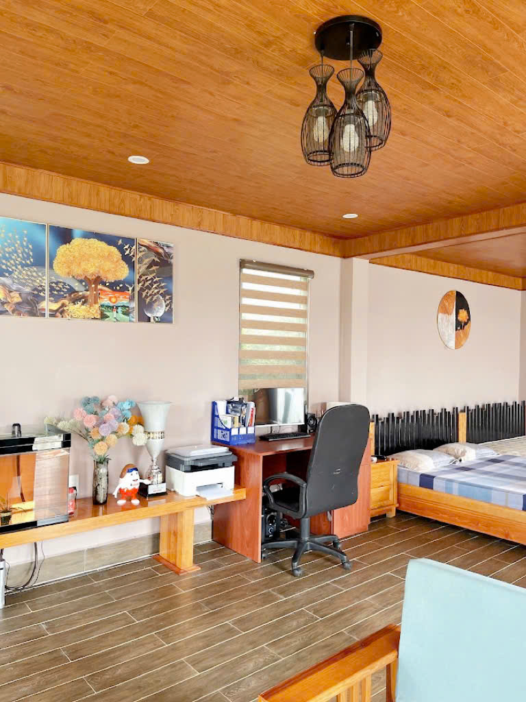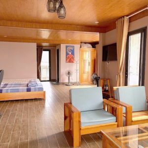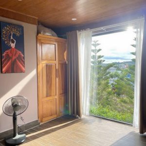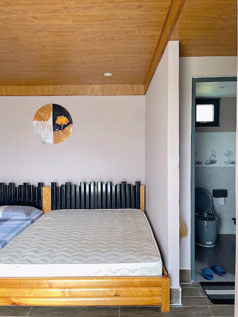 Khu Nhà Hồng được thiết kế ấm cúng với nội thất gỗ chủ đạo, mang lại cảm giác gần gũi và thư giãn. Bên trong có giường đôi rộng rãi, khu vực làm việc riêng với bàn ghế tiện nghi, cùng không gian tiếp khách thoáng sáng nhờ cửa kính lớn nhìn ra rừng thông. Phòng tắm hiện đại, đầy đủ tiện nghi. Đây là lựa chọn lý tưởng cho các cặp đôi hoặc gia đình nhỏ muốn tận hưởng kỳ nghỉ yên bình giữa thiên nhiên.