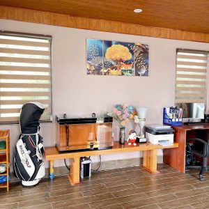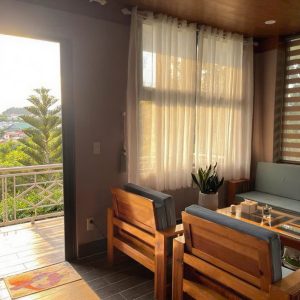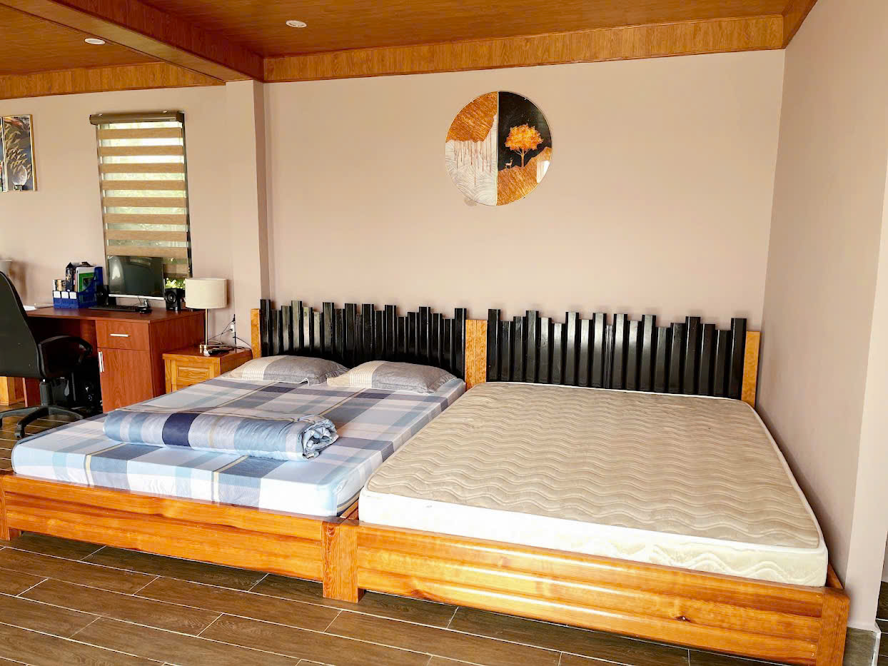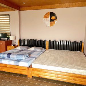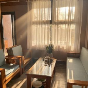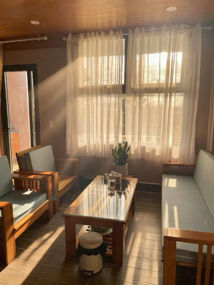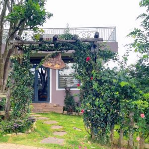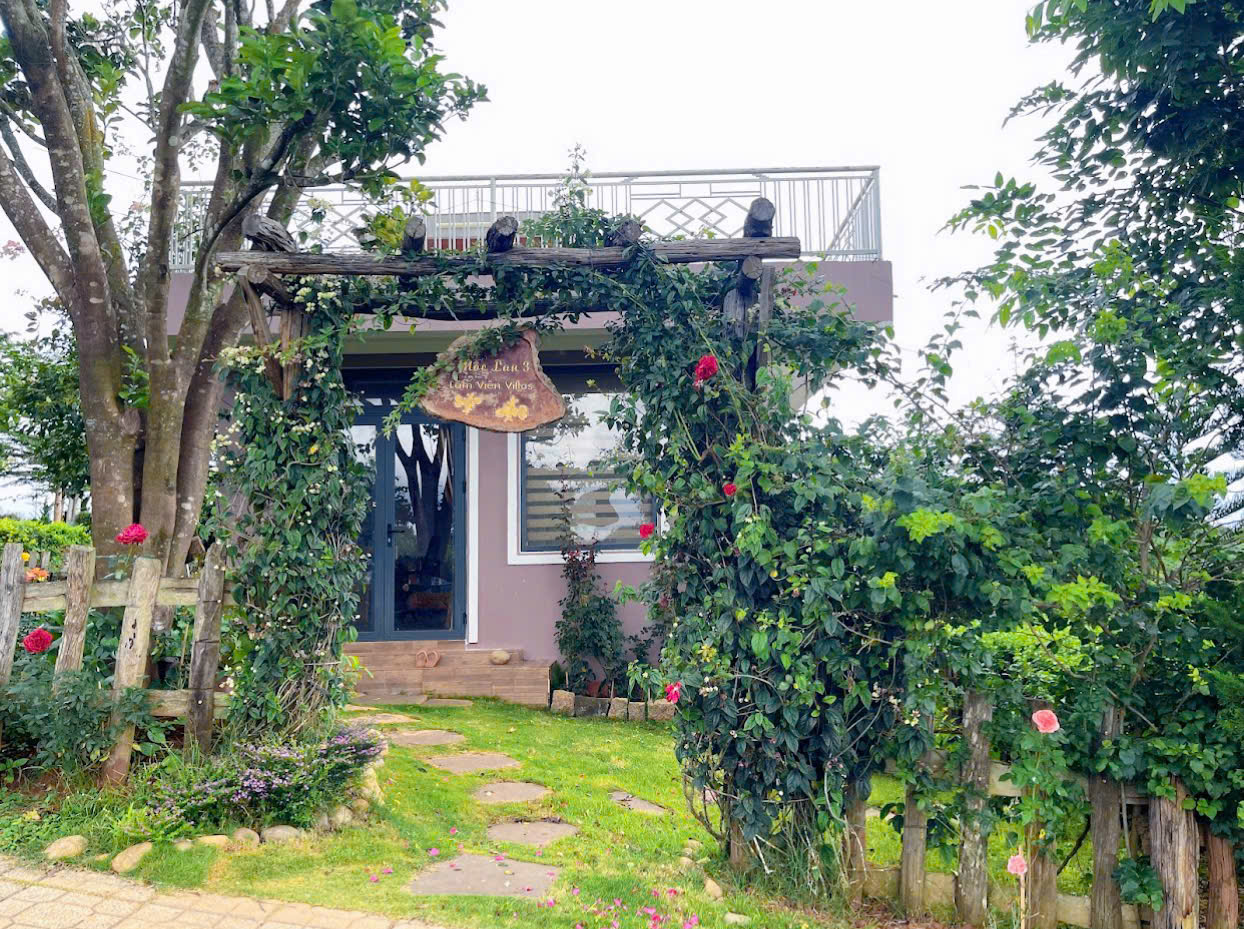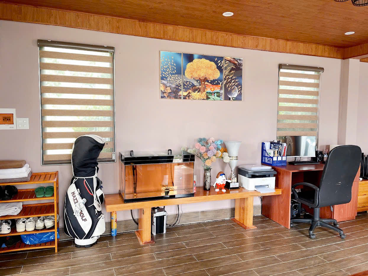 Khu Nhà Hồng được thiết kế ấm cúng với nội thất gỗ chủ đạo, mang lại cảm giác gần gũi và thư giãn. Bên trong có giường đôi rộng rãi, khu vực làm việc riêng với bàn ghế tiện nghi, cùng không gian tiếp khách thoáng sáng nhờ cửa kính lớn nhìn ra rừng thông. Phòng tắm hiện đại, đầy đủ tiện nghi. Đây là lựa chọn lý tưởng cho các cặp đôi hoặc gia đình nhỏ muốn tận hưởng kỳ nghỉ yên bình giữa thiên nhiên.